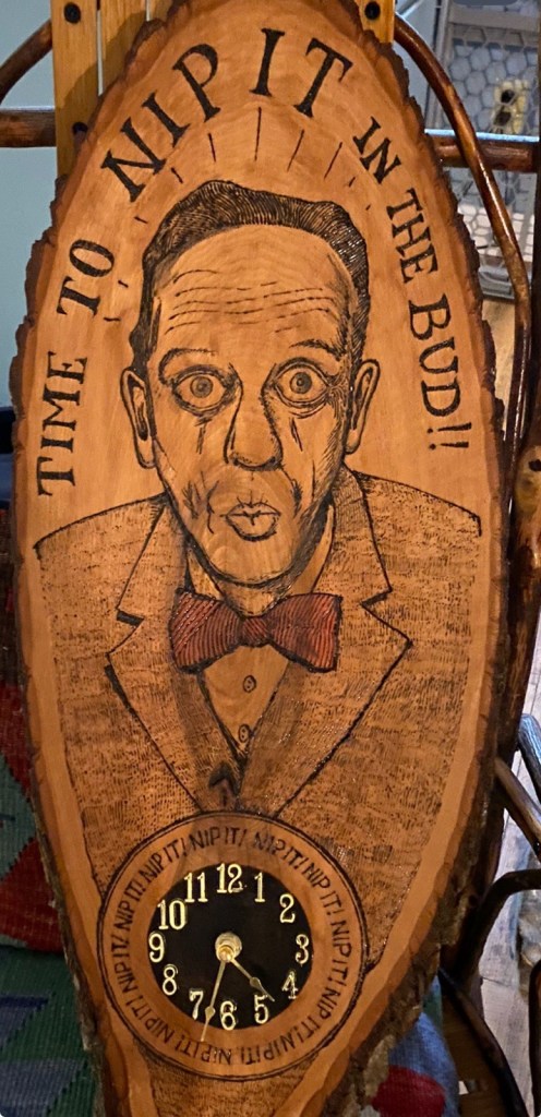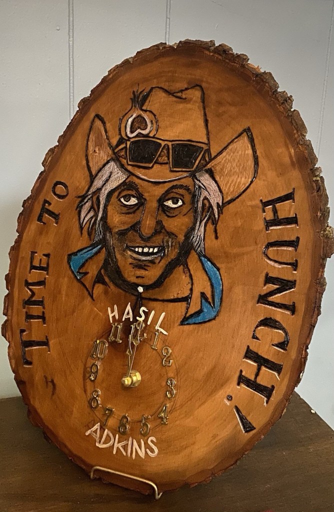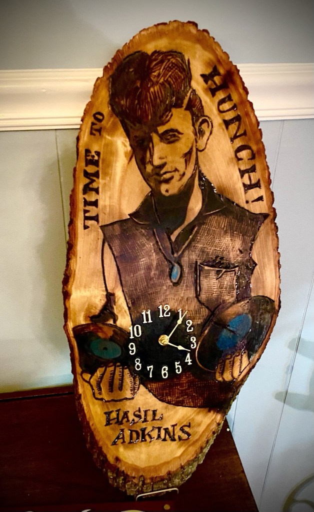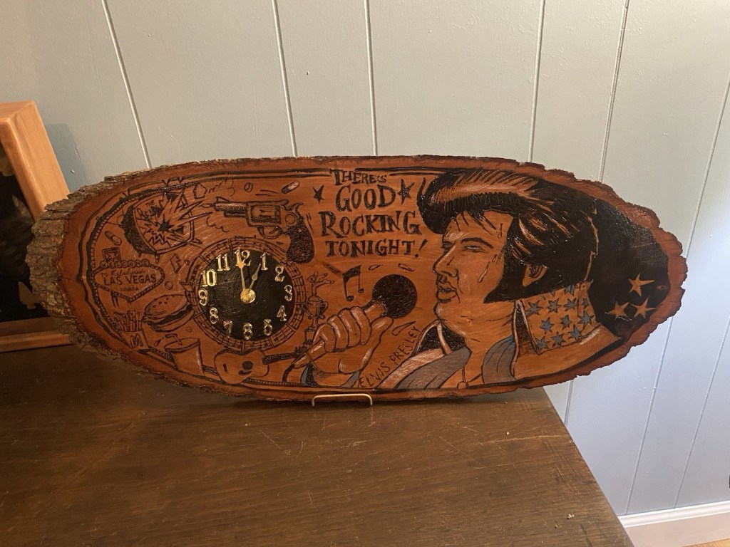 These are my kitschy wall hangings/clocks, woodburnt on log slices & made to order, with a specialty leaning towards hillbilly & country musicians. These designs are available for commission, or contact me for unique new designs of your choosing!